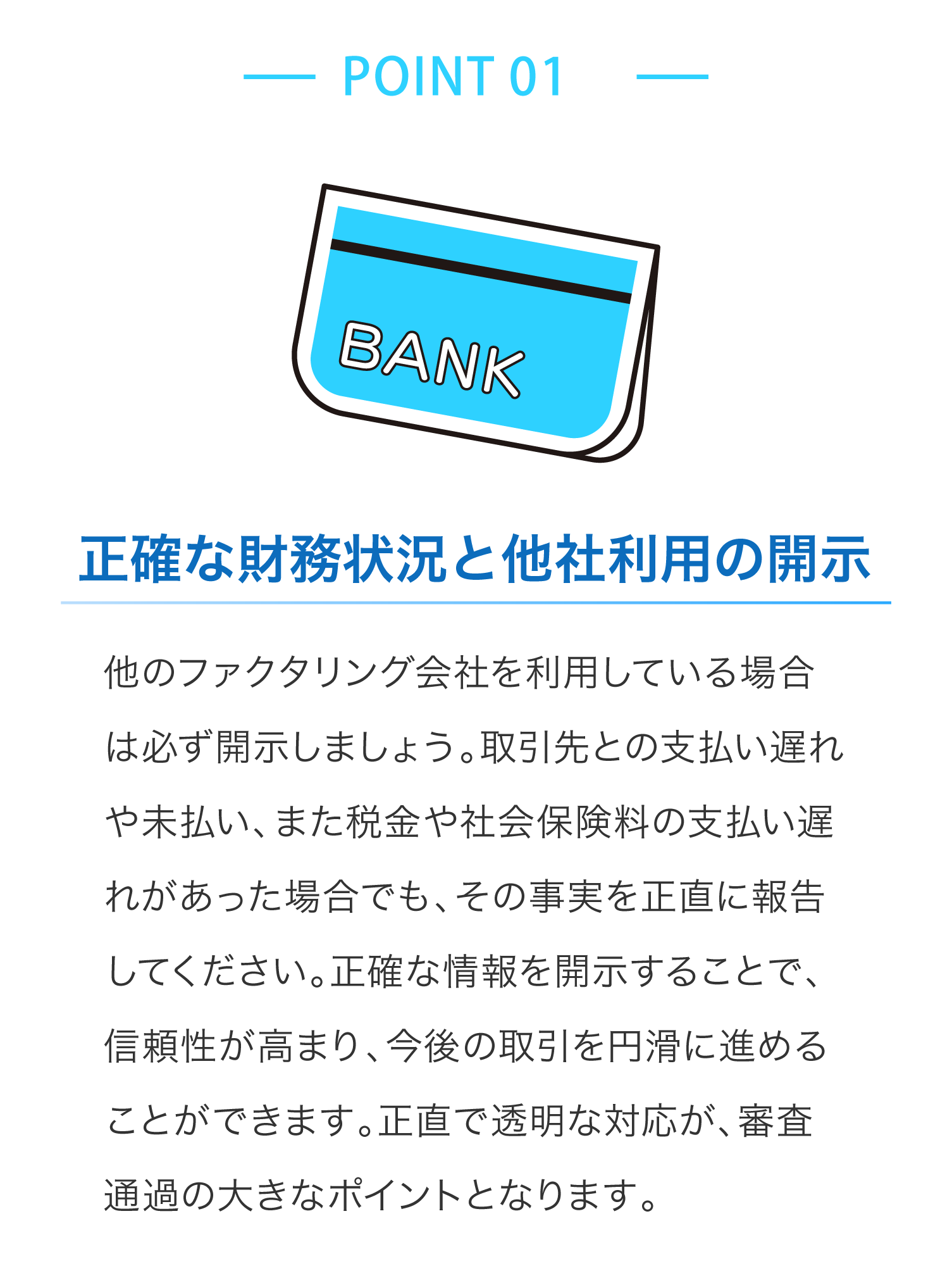必要書類は、請求書、身分証、通帳、決算書の4点のみです。